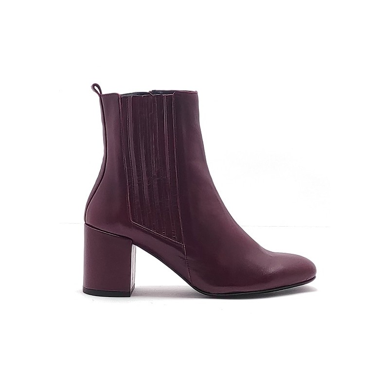 Altura tacón: 7 cm | Corte y forro: 100% piel | Suela: Caucho flexible | Material y color: Piel mestizo burdeos