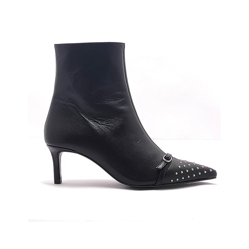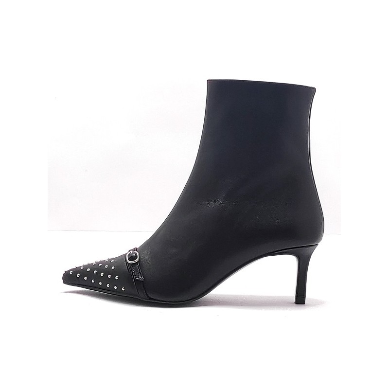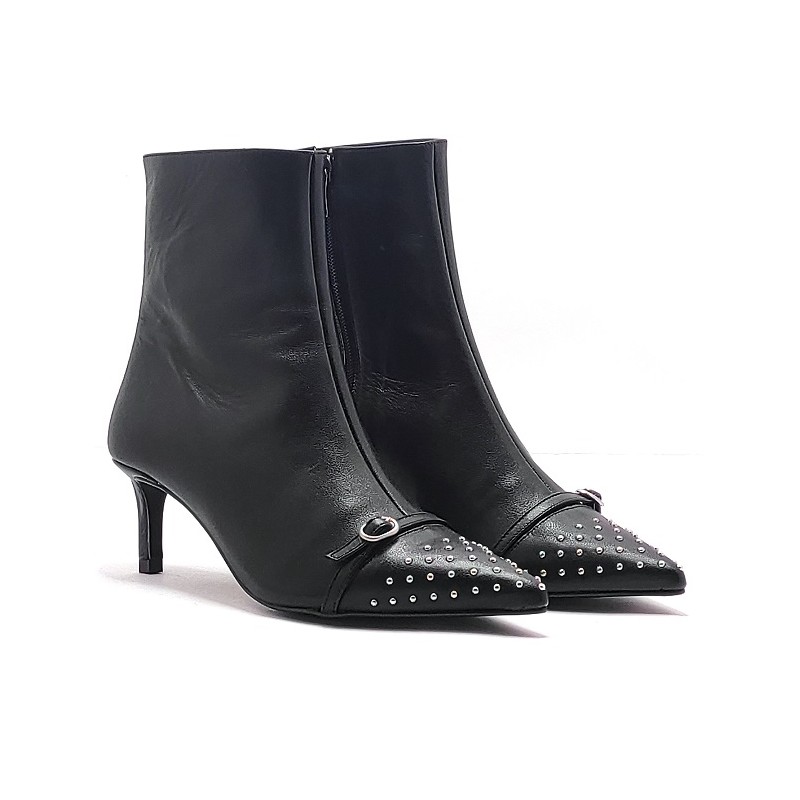 Este botín es la elección ideal para la mujer que busca un calzado que eleve cualquier look con una silueta clásica y versátil. Donna esta confeccionado en napa negro, una piel de acabado impecable que se adapta al pie perfectamente. Su diseño de puntera afilada y caña media, unido a un estilizado tacón, no nos olvidemos de su detalle en su puntera.